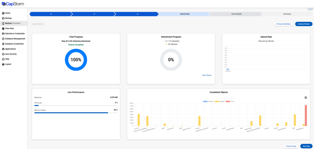This stage is where the restore job actually writes data back into the target Salesforce org and shows live progress while it runs. Think of it as your “restore dashboard” – you can monitor overall progress, object-by-object outcomes, attachment handling, and basic container performance.