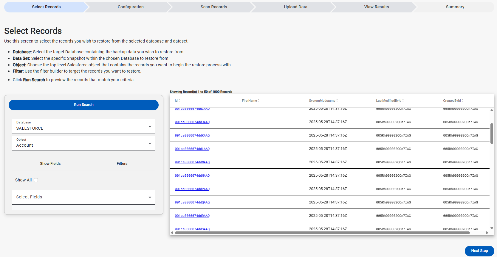 The Select Records stage of the Restore Wizard allows for the selection of the target database to restore records from as well as the top level object to start the restoration. Filters can be applied to the object to scope down the records to the target candidates for restoration as well as using the Run Search button to view the top level objects before beginning the process.