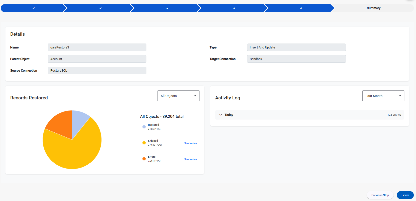 The Summary step of the Restore Wizard provides a high-level report of the restore job: what ran, where it restored to, how many records were restored/skipped/marked error, and an activity log that can be used for auditing and troubleshooting.